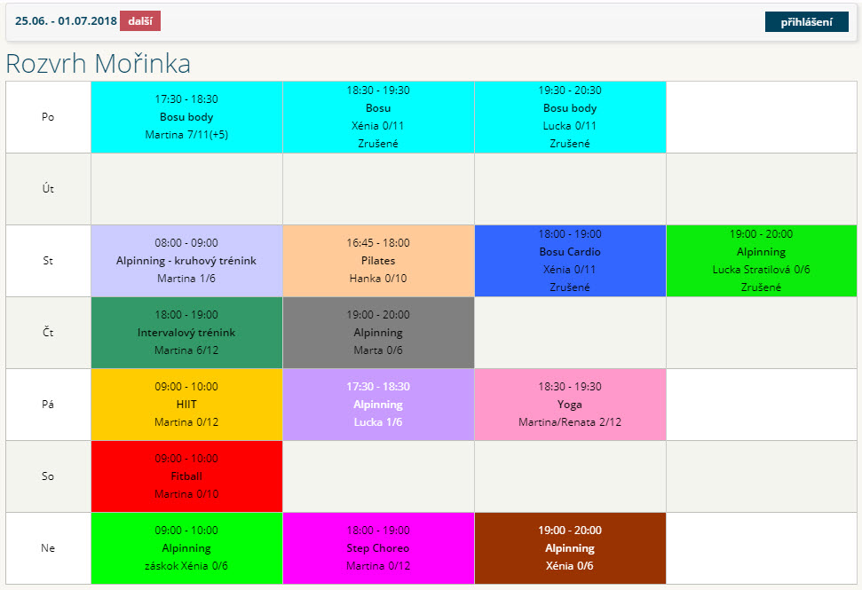 Vždy aktuálny a prehľadný rozvrh umožňuje online rezervácie a objednávky permanentiek. Zákazníci získajú prehľad o obsadenosti jednotlivých lekcií.